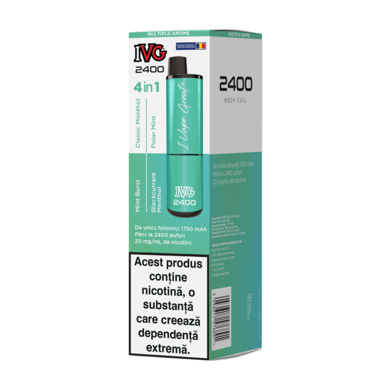 IVG 2400 Menthol Edition este alegerea ideală pentru iubitorii de mentol pur și intens — oferă 4 arome diferite, toate mentolate, într-un singur dispozitiv, cu autonomie de până la 2400 de pufuri.