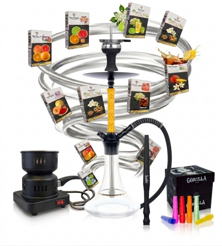 Setul conține: Narghilea completă Aladin M3.1, Aprinzător cărbuni 500W, Cărbuni Black Diamonds 26mm (1Kg), Tutun narghilea True Passion 50g, Set mustiucuri